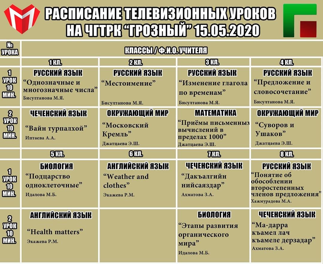 Расписание телевизионных уроко на ЧГТРК "ГРОЗНЫЙ".