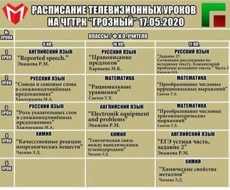 Расписание телевизионных уроков на ЧГТРК "ГРОЗНЫЙ".